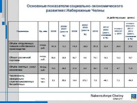 10. Naberezhnye Chelny OPEN CITY Основные показатели социально-экономического развития г.Набережные Челны (в действующих ценах) Параметры Ед . и зм . 2008 2008 / 2007 (рост в %) 2009 200 9 / 200 8 (рост в %) 2010 20 10 / 200 9 (рост , снижение в %) январь-февраль 201 1 январь-февраль 20 11 / 20 10 (рост , снижение в %) Объём отгруженных товаров собственного произво д ства млрд. руб. 181,6 13,3 114,5 -36,9 151,6 32,4 24,4 37,8 Оборот розничной торговли млрд. руб. 59,8 35,6 62,7 4,8 74,1 18,2 13,3 18,7 Объём платных услуг населению м лрд руб. 19,9 26,8 21,6 8,5 24,1 11,6 4,7 11,6 Численность официально зарегистрированных безработных тыс. чел. 5,3 55,8 14,4 272,1 7,8 -46,1 7,3 -54,5